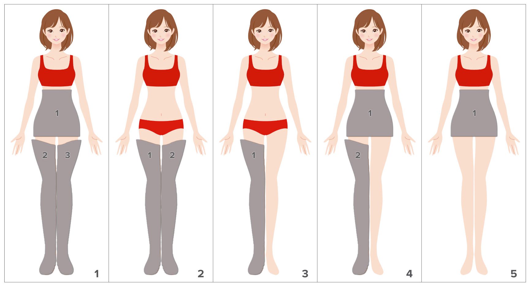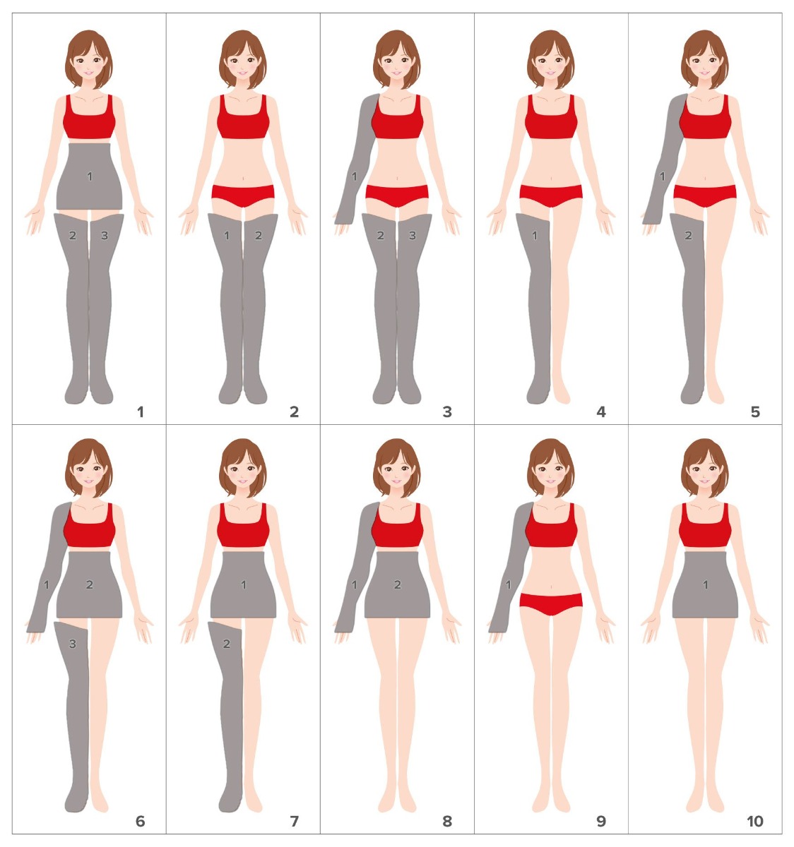 Beine, Gesäß-Bauchband und Armbänder sind leicht tragbar und mit selbstschließendem Reißverschluss ausgestattet (das Gesäß-Bauchband hat einen verstellbaren Klettverschluss). Die Leggings sind zum Beispiel mit einem selbstsichernden Reißverschluss ausgestattet, der, auch wenn er nicht vollständig geschlossen ist (falls die Leggings länger als das Bein ist), einen regelmäßigen Gebrauch ermöglicht.