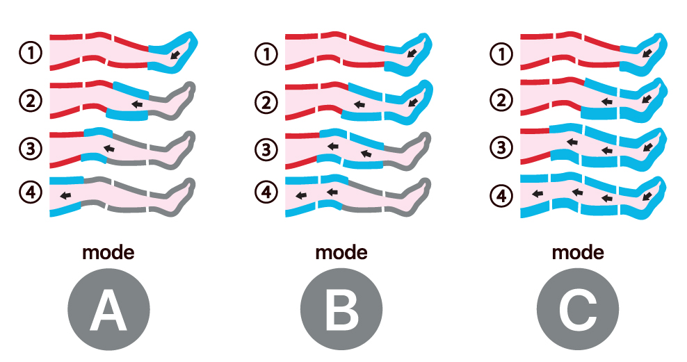 - MODUS C: Der Programmablauf sieht das sequentielle Aufblasen aller Kammern und dann das gleichzeitige Entleeren vor, ideal für eine tiefere Massage